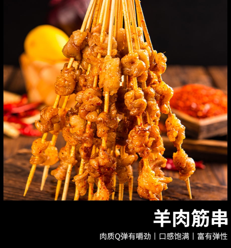喜歡有嚼勁口感的千萬別錯(cuò)過羊肉筋串!精選羔羊身上的優(yōu)質(zhì)肉筋,處理得干凈又衛(wèi)生??竞玫难蛉饨畲?,外表裹著一層油亮的醬汁,看起來就讓人食欲大增。